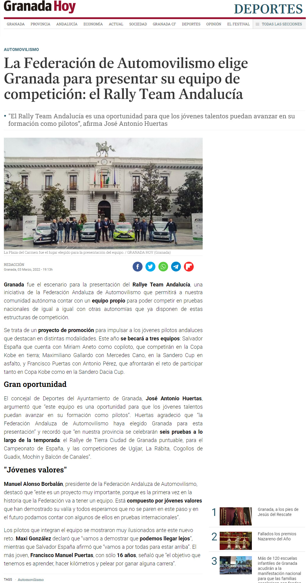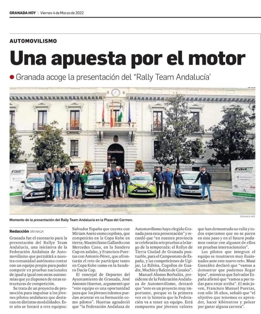Noticia Granada Hoy Digital presentación Rally Team Andalucía 030322 – pincha para ir.